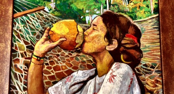 This photo was taken at Harmony Hall gallery in Ocho Rios, Jamaica. Rani Carson, a New York-based professor of art, first came to Jamaica in 1986 and became enchanted with the island. She embraced the Rastafarian faith and lifestyle which she brilliantly depicts in her gouache paintings. Her work has been showcased in both the U.S. and at Harmony Hall in Jamaica.