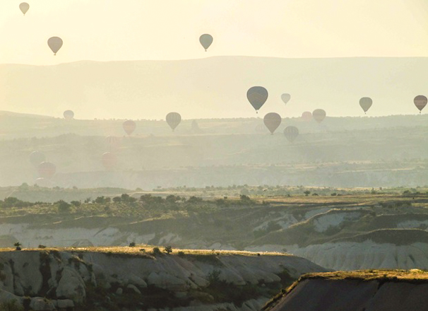 Travel the World – At sunrise, hot air balloons float along the horizon as morning mist slowly fades and the sun’s warm rays coat Cappadocia’s rocky landscape. This photo was taken from a hilltop in Uchisar just in time to photograph the ballons before they disappeared into the light.
