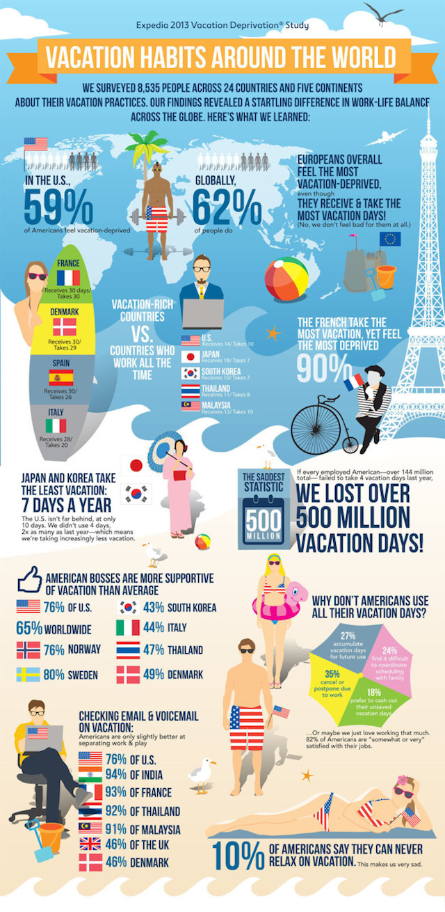 We all know the deal: all work no play, or at least only seven-30 days of play out of 365 (weekends are debatable when it comes to relaxation) depending on where in the world you live. This infographic, created by Expedia, rounds up the facts about vacation time in the U.S., Europe and many parts of Asia. Not surprisingly, most people feel that they just don’t get a long enough holiday to unwind and replenish depleted energy from so much time on the job.