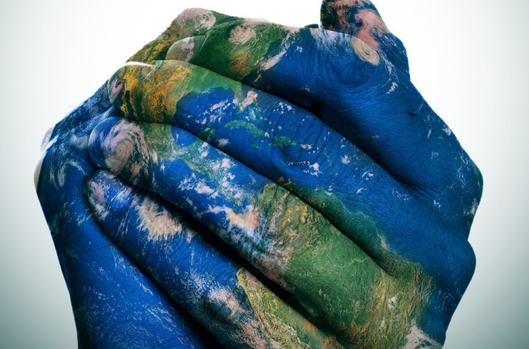 Feature image of a man’s hand painted as the globe for World Peace Day via Shutterstock