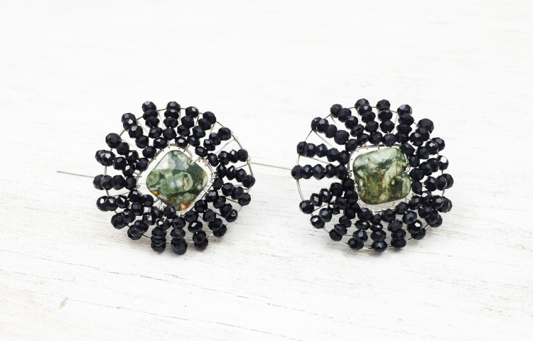 I love collecting seashells by the seashore–my most prized collectables as a little girl were complete sand dollars and urchin shells. These earrings are inspired by the radial patterns of their counterparts. Crafted from sterling silver wire, black faceted spinel, and ocean jasper…wear your inner urchin girl with an “all-grown-up” style.