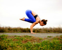 Arm balances build strength in the arms, shoulders, wrists and core muscles, moreover, they will empower you to feel strong from the inside out! From a toe squat, separate your knees wide and lift your hips up. Place your hands shoulders distance apart, wrist crease parallel to the front of the mat. Draw your elbows in so that they are in the same line as the wrists. Shift your body forward until your elbows stack over your wrists. Your feet will lift off the floor. Press inner big toe mounds together. Hug knees energetically toward each other. Engage your pelvic floor muscles and press the belly toward the spine.