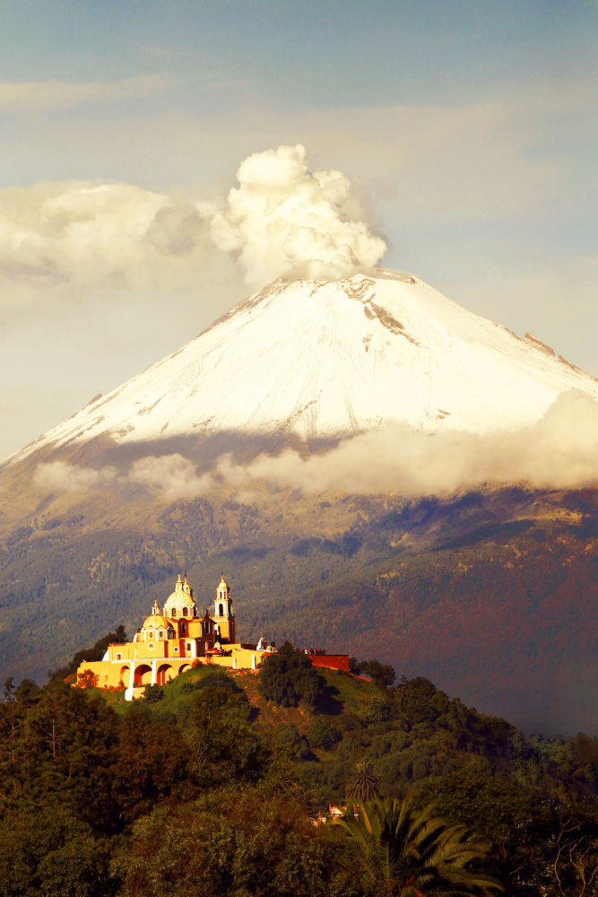 Cholula started as a site of religious worship to Quetzalcóatl, the feathered-serpent god that was the primary deity for the Aztecs. The ceremonial center founded by exiled Toltecs grew into modern-day Cholula (“water which falls on the place of escape”). The city has 365 churches (for those that can’t make up their mind, one for each day of the year), an impressive artisan market and flowers of every color. In the background stands Popocatépetl, an active volcano fabled to be the lover of the dormant Iztaccihuatl sheltering Mexico City.