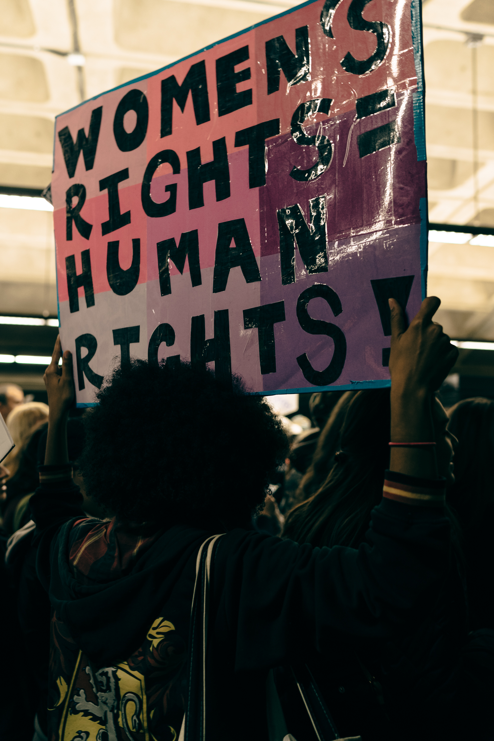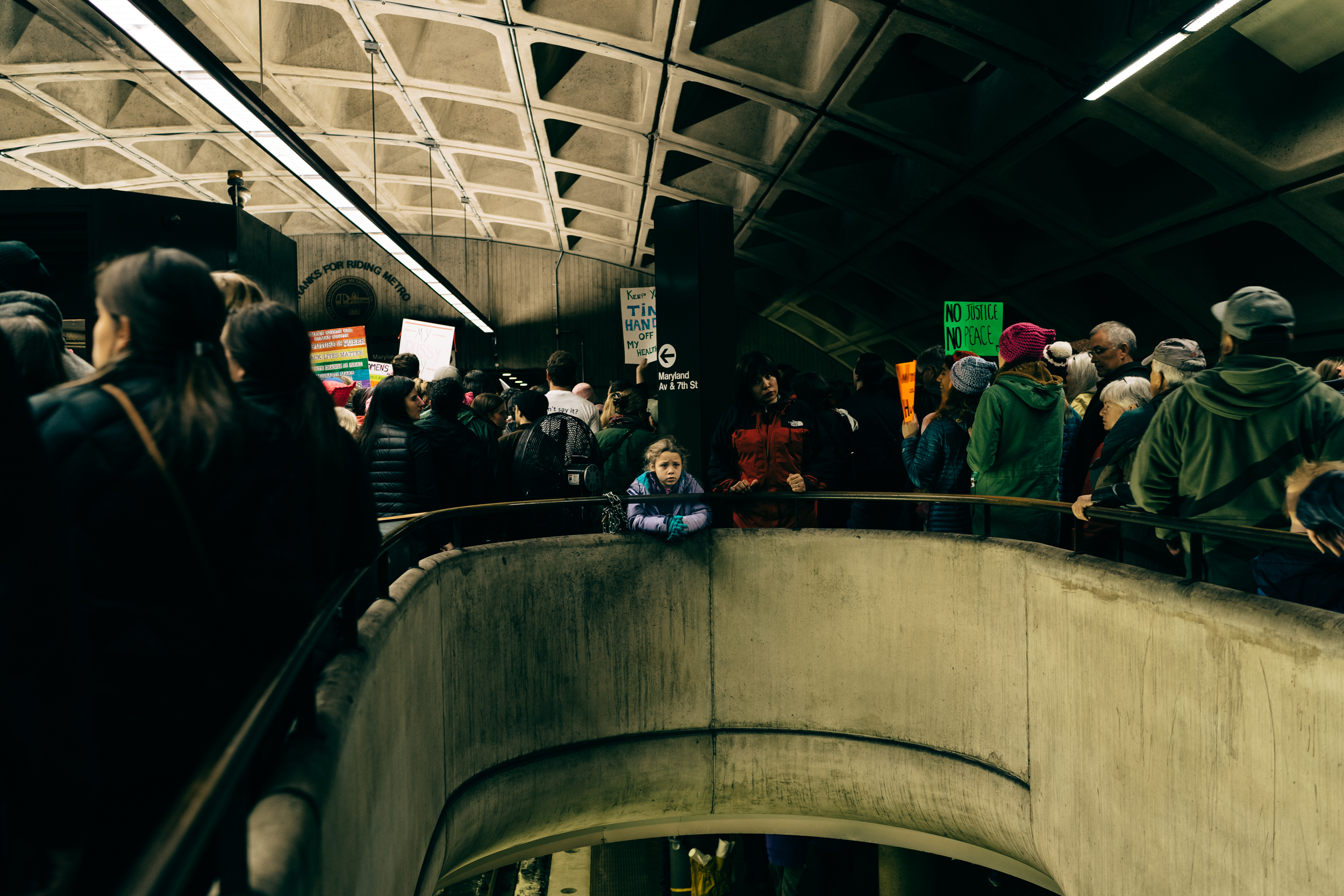 A girl holds a sign supporting women’s rights in a jam packed L’Enfant Plaza.