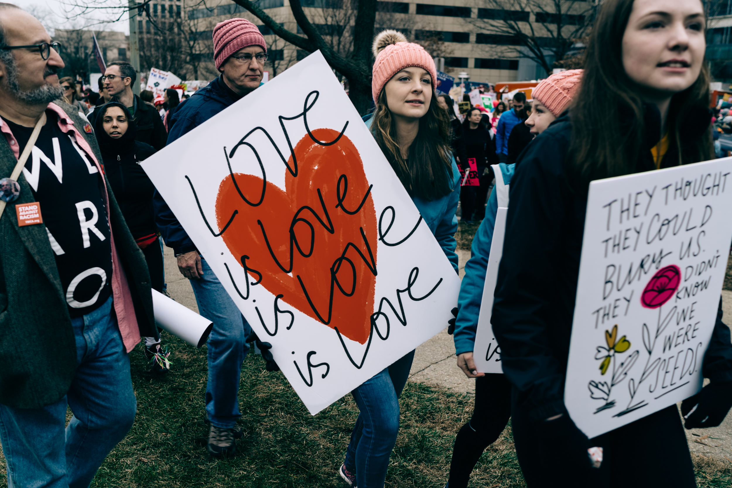 A protester marches with a message felt throughout the day. Love, unity and a desire for a better future.