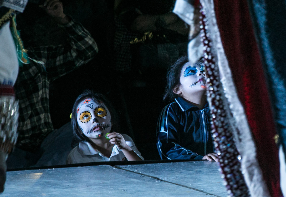 A crowd packs the square as local high school students begin a show of traditional harvest dances. The graceful performances honor the deceased, the upcoming crop, and the prolific fish population in the lake surrounding Patzcuaro. Children watch with wide eyes as the brightly colored dancers light up the night.