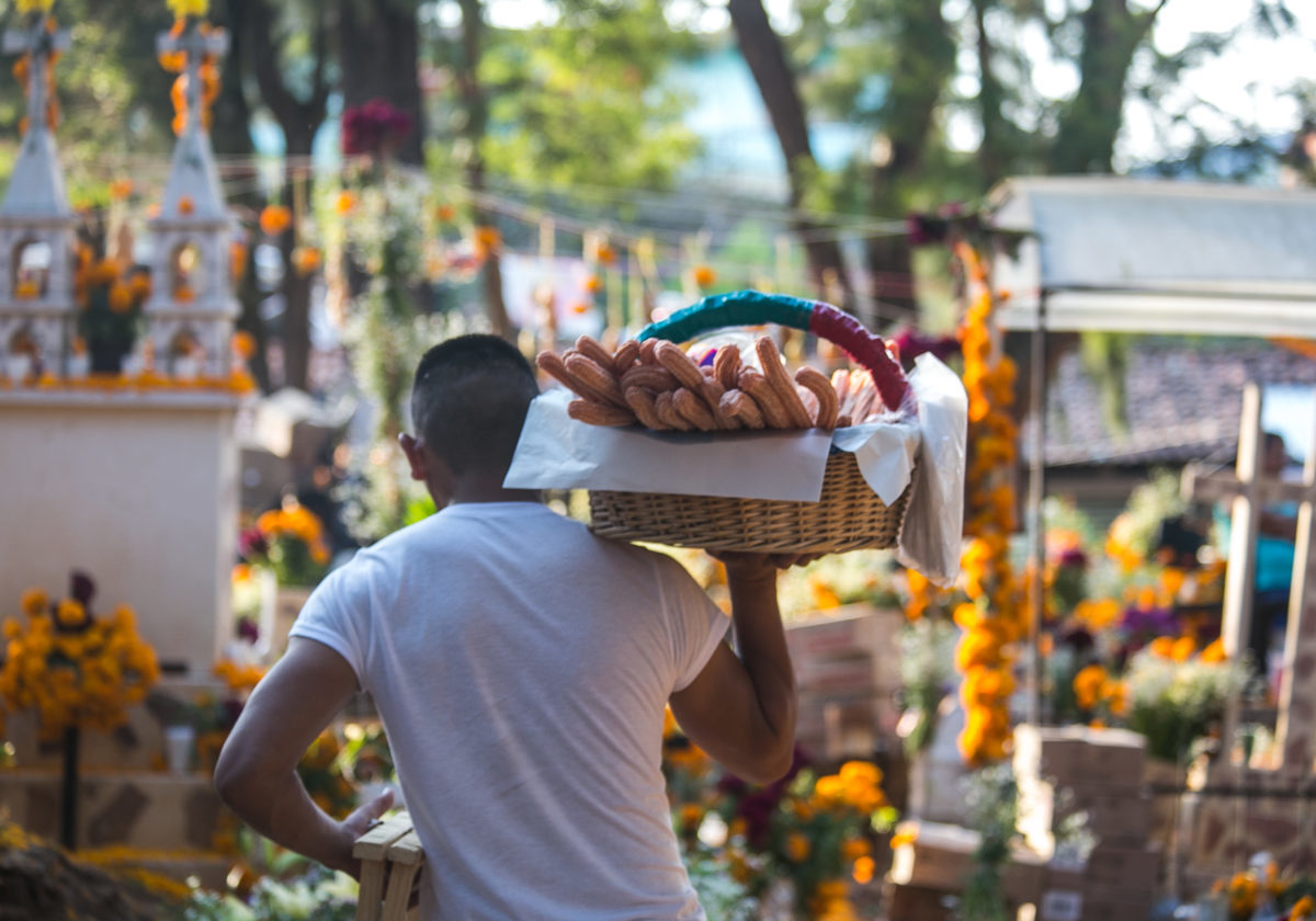 A churro vendor walks amidst the gravestones in the local cemetery.