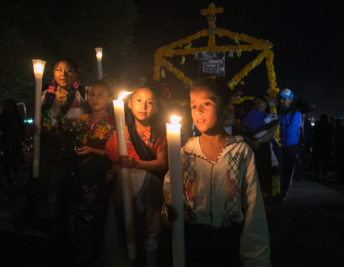 Many families invite mariachis or brass bands to follow them throughout the night. Families lead the procession, carrying the large wooden altar face above their heads from the evening service to the cemetery. The bands follow behind, calling out to the deceased with an ensemble of horns.