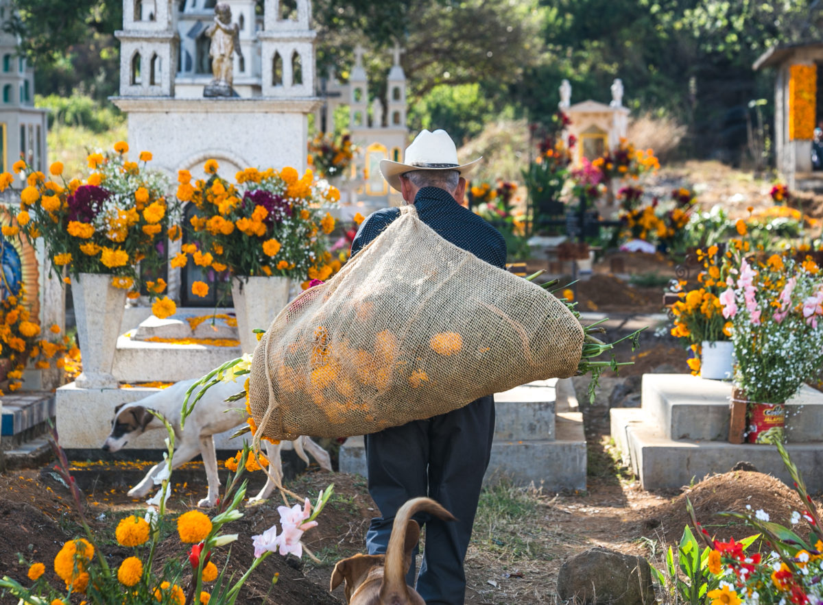 A man carries a bag of freshly picked marigolds through the cemetery.