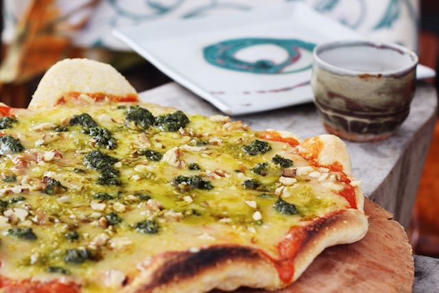 Then came the pizzas — vegan, fire-grilled, and unexpectedly indulgent. The first arrived crowned with homemade tomato sauce, basil pesto and walnut crumbles, the cornmeal-laced crust lending each bite a gentle sweetness and crackle. When Lisa sliced into it, molten vegan cheese and olive oil slipped toward the plate. The second pie balanced sweet and savory: pineapple and caramelized shallots atop tomato sauce and cheese. The tang of fruit against buttery shallot was revelatory — a reminder that playfulness belongs at the table.